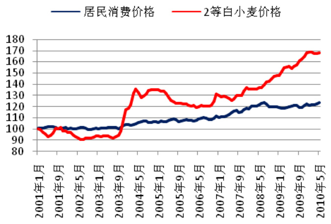 - 描述:2001年至2010年居民消费价格指数和二等白小麦价格指数走势。