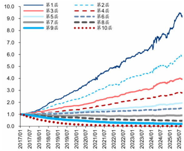 - 明确分层净值分布,第一层(Top组)持续领先其他层级,验证因子的预测分层意义。
