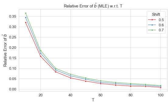 - 图B.2/B.4显示MLE估计误差随时间也递减,同时因核的偏移参数$\varepsilon$影响较小,图中曲线紧密分布。