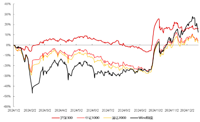 - 描述: 展示2024年1月2日至12月23日期间沪深300(大盘)、中证1000、国证2000(小盘)及Wind微盘指数的累积收益率走势。