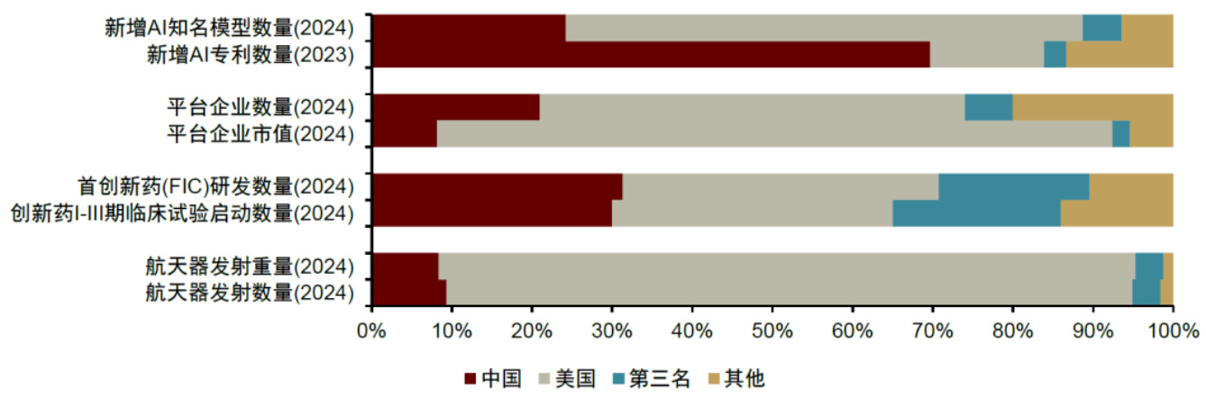图表分类展示了中美在新增AI知名模型数量、新增AI专利量、平台企业数量及市值、创新药(FIC)研发及临床试验及商业航天器发射重量和次数等关键指标的占比。