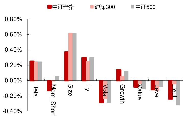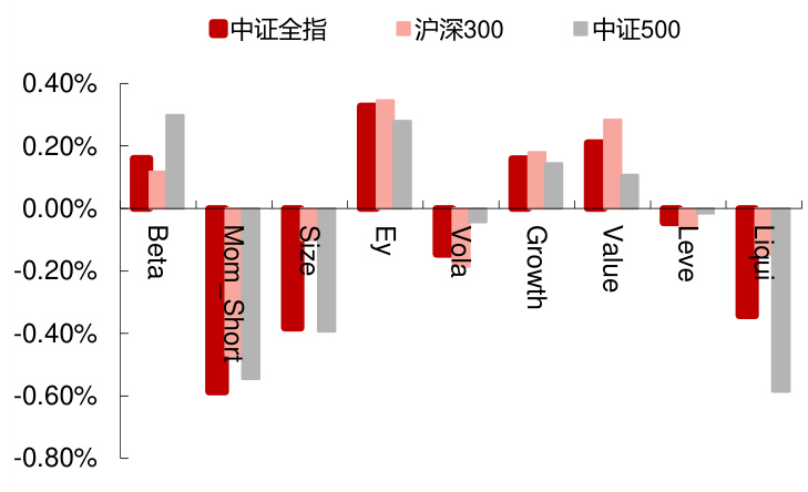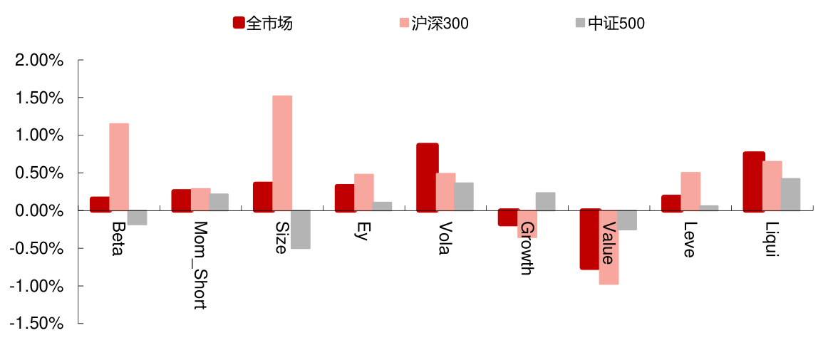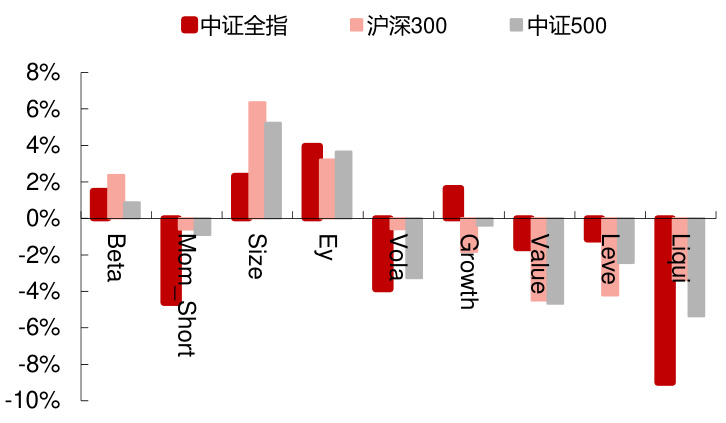 - 中证500表现为短期动量、大市值、高波动因子表现良好。