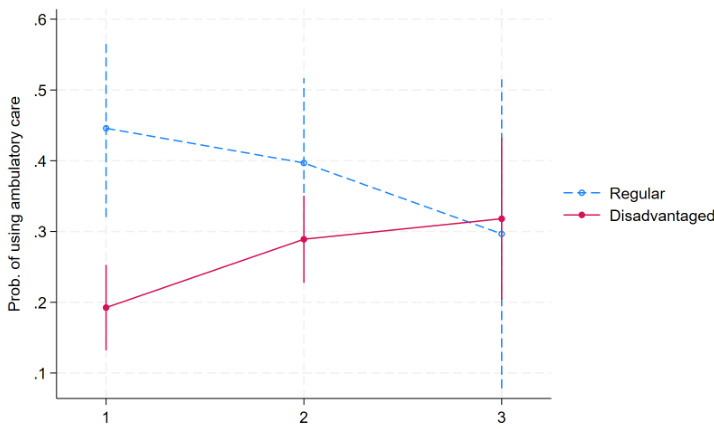 - 弱势群体使用门诊概率较低,尤其是病情轻者,随着疾病严重程度提升差异缩小。