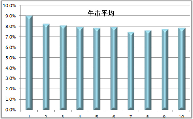 - 描述:两图显示基于总市值从小到大排序的十等分组合在熊市与牛市的平均收益条形图。
