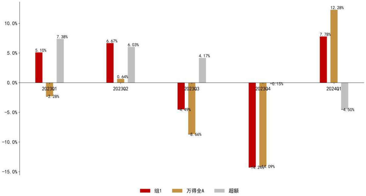 - 2023Q1-Q4期间,组1表现波动,2023Q1和Q2组1均实现正收益,Q3、Q4转负。