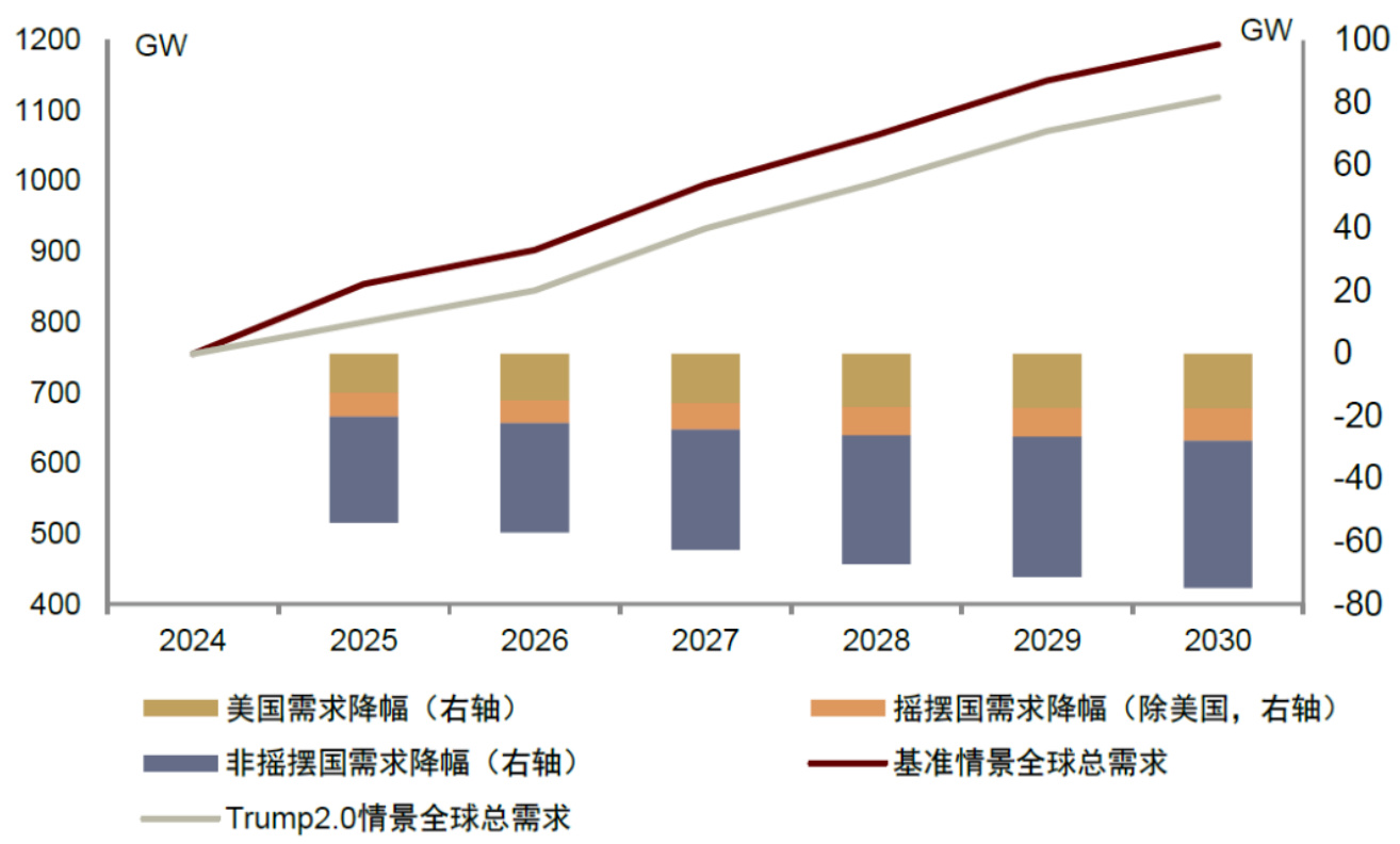 - 特朗普2.0可能使全球油气价格降低0%-10%,从而在非摇摆国家引起清洁能源需求约4%左右的跌幅。整体看,2025-2030年全球可再生能源新增装机需求降幅介于2.4%-6.3%之间。