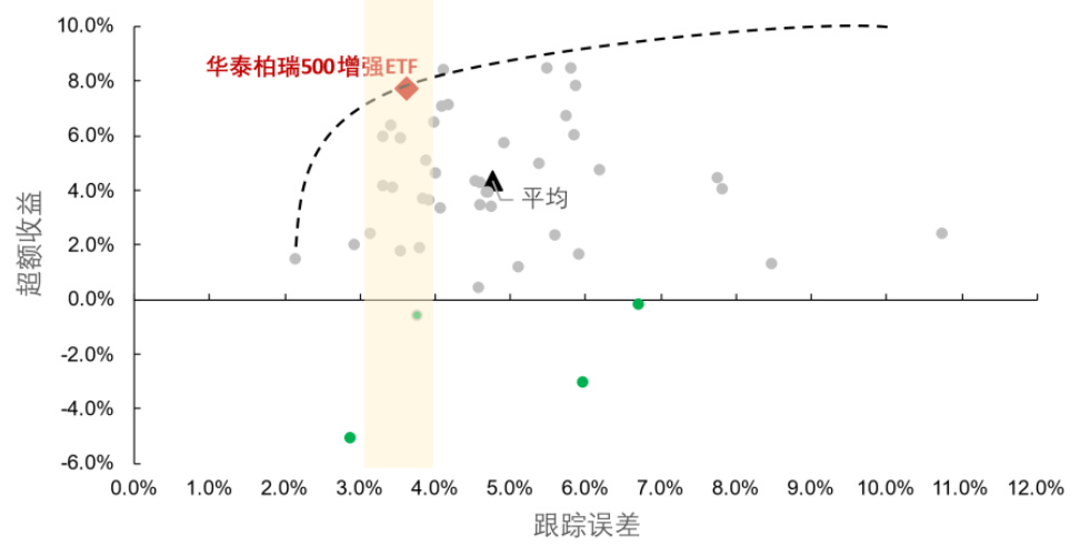 - 华泰柏瑞500增强ETF明显集中于超额收益高且跟踪误差低的理想区域,显著优于大部分竞争产品。