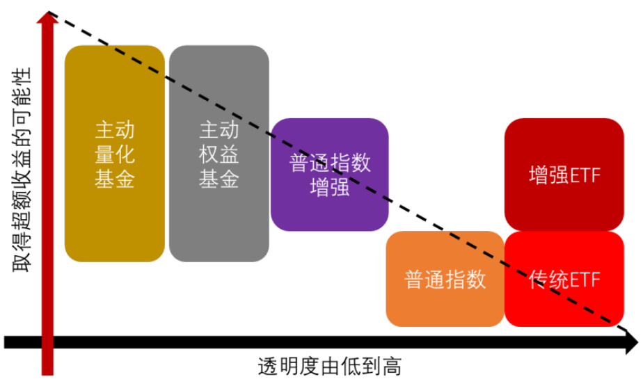 - 该图划分不同基金类别(主动量化基金、主动权益基金、普通指数增强、传统ETF、增强ETF)在透明度与获取超额收益可能性上的关系,增强ETF位于右上角,展示行业模型下最佳平衡点。