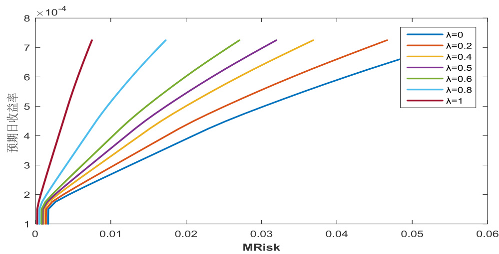 - 描述: 𝜆取不同值时投资组合MRisk与预期收益率的有效前沿曲线。