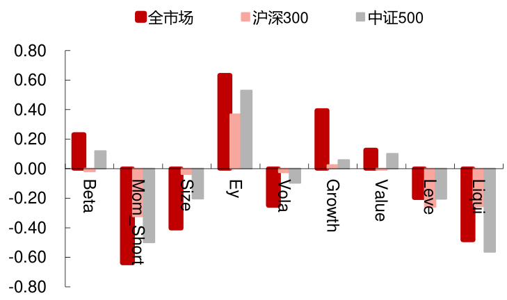 - 全市场:短期动量表现较好(正11%),但小市值、波动和换手率为负,表明较小市值和高换手的股票短期表现较弱。
