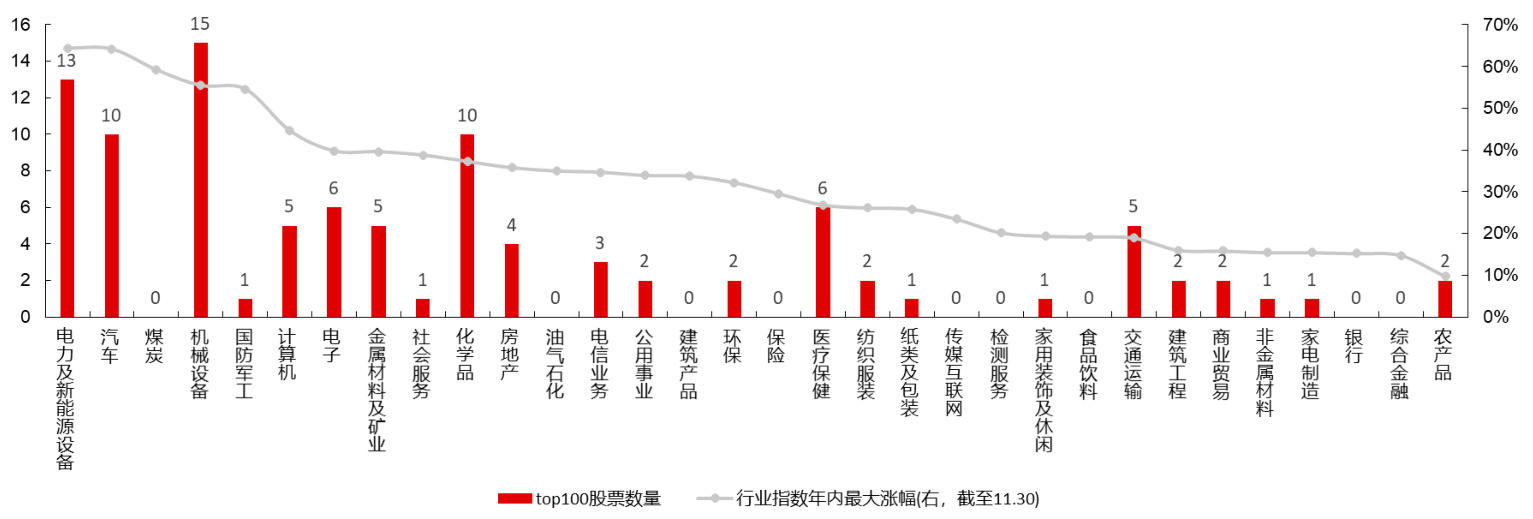 - 依据2022年前11个月最大涨幅前100股票分析,机械设备、电新、汽车、化学品行业强势个股数量最多,反映二季度弹性行情中热点特征。