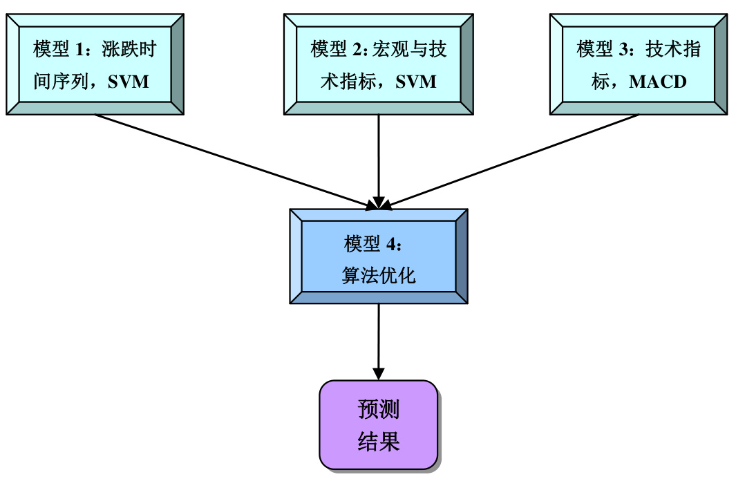 展示四个子模型结构和融合关系:模型1(时间序列涨跌)、模型2(宏观经济+技术指标)、模型3(趋势控制MACD)、模型4(算法优化)。