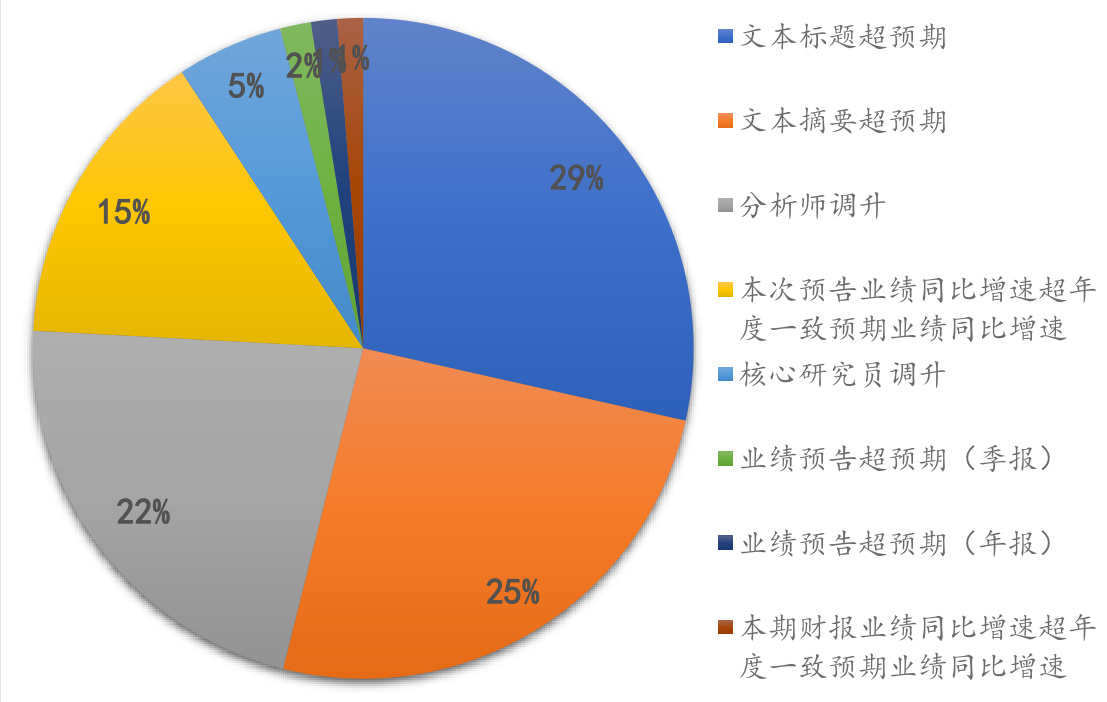 - 八种超预期类别中,文本标题超预期占29%,文本摘要超预期25%,分析师调升22%,占据绝大部分。