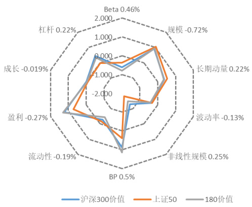 报告对表现最佳的三只指数(中证500价值、中证500、上证小盘)和表现最差三只指数(沪深300价值、上证50、180价值)进行了因子暴露度对比: