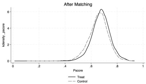 - 匹配前后处理组与对照组倾向得分分布趋于一致,图形收敛,验证了匹配质量,排除选择偏差。
