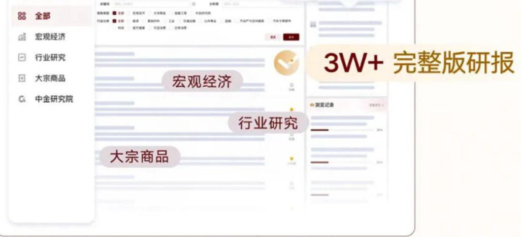 截图显示了报告筛选和分类界面,突出“完整版本”“宏观经济”“行业研究”等标签,提升检索效率。研究框架和数据库进一步支持用户快捷定位所需信息,强化系统化研究逻辑和数据驱动力。