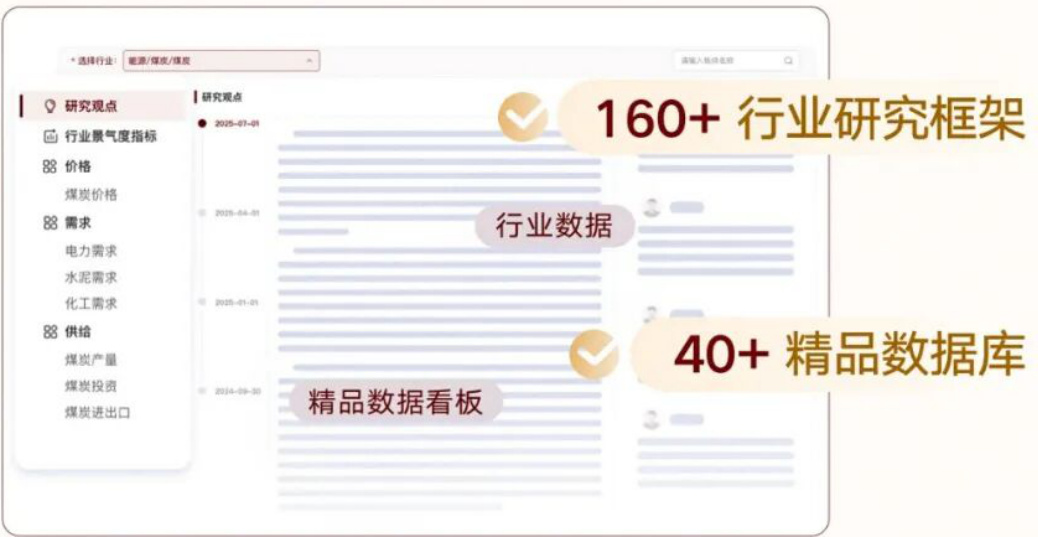 - 数据库包括160+行业研究框架和40+精品数据库,支持研究观点查询和数据看板展示。