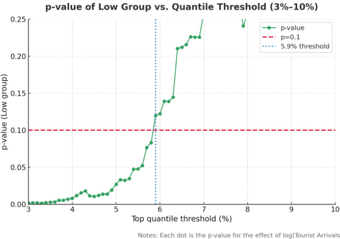 - Hansen模型估计旅游阈值约445万游客/年,阈值以下土地价格受旅游影响不显著系数0.011,阈值以上显著为0.064。