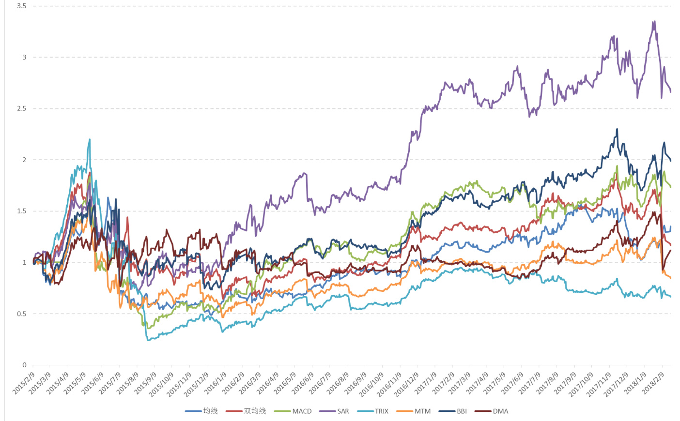 2. 通过广泛测试多种趋势技术指标,发现SAR与BBI指标在近三年的市场环境中表现较为突出,简单均线表现尚可,而MTM与TRIX表现不佳。