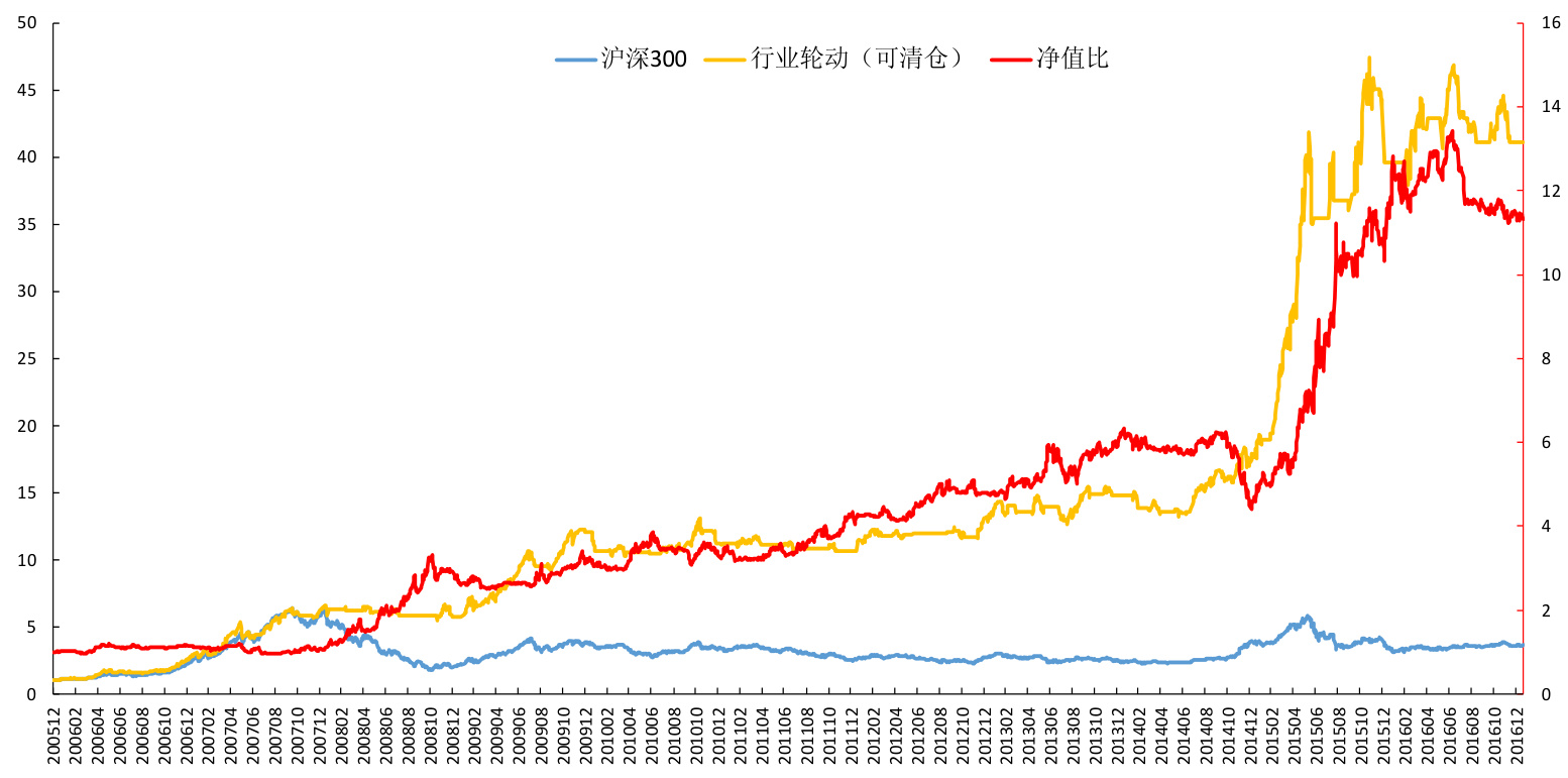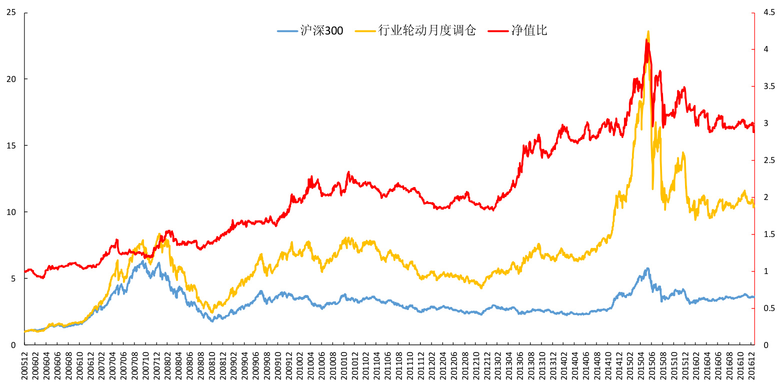 - 定期(月度)调仓选出表现最好的5个申万一级行业,等权持有,回测2006-2017年。