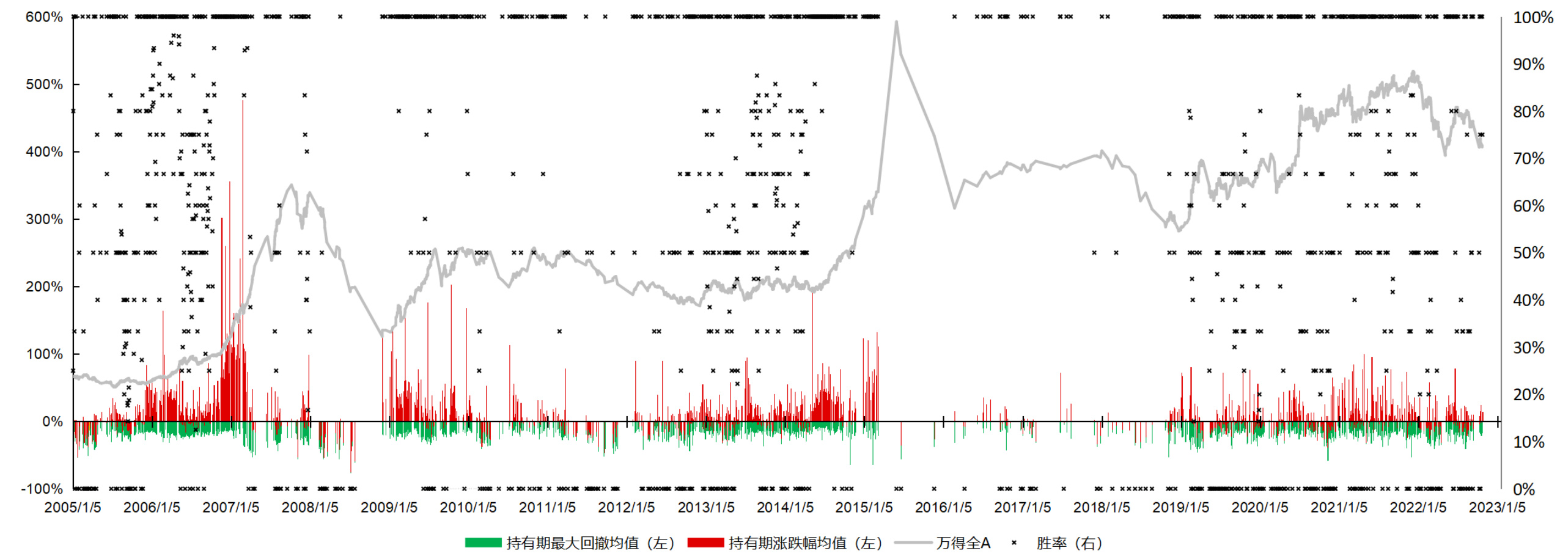 使用历史回测时间序列图,红色条柱代表持有期内的平均涨幅,绿色条柱为最大回撤值,灰线为万得全A指数,黑色十字表示胜率,以直观方式揭示信号仅在部分牛市周期真正活跃且表现良好,回撤控制也较稳定。