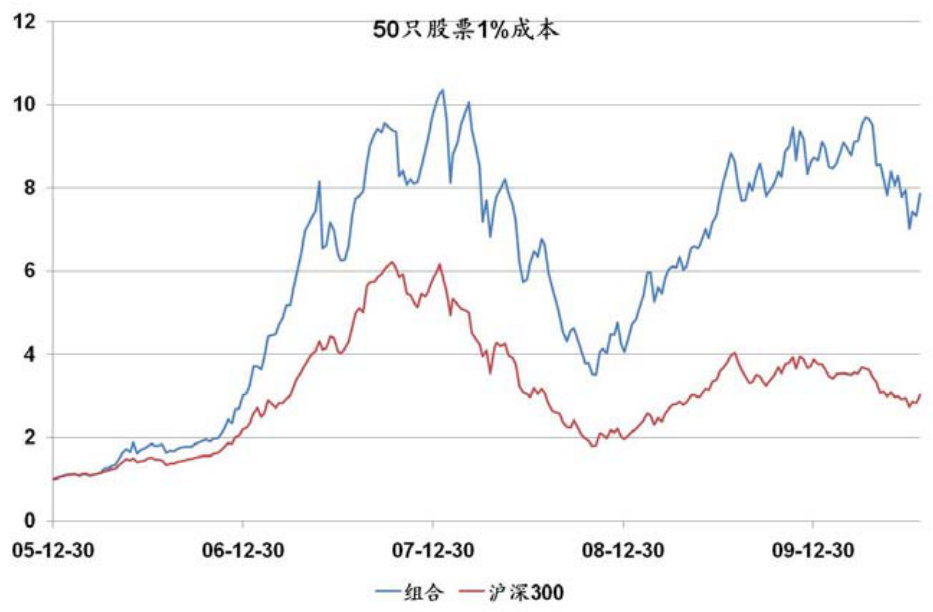 - 图10显示50只股票组合累计收益率明显优于沪深300指数,约70%。