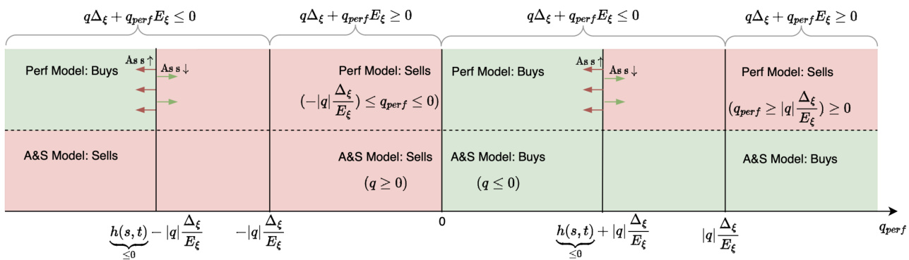 - 描述: 横轴为执行性市场制定价者的库存$q{\text{perf}}$,图中区域区分执行性策略(上半区)与A&S策略(下半区)的买入/卖出决策。