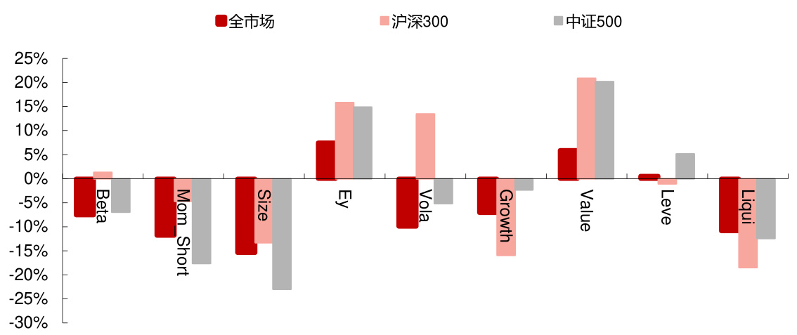 - 高成长、动量(Momentum)的收益为负,符合市场情绪调整带来的避险倾向。