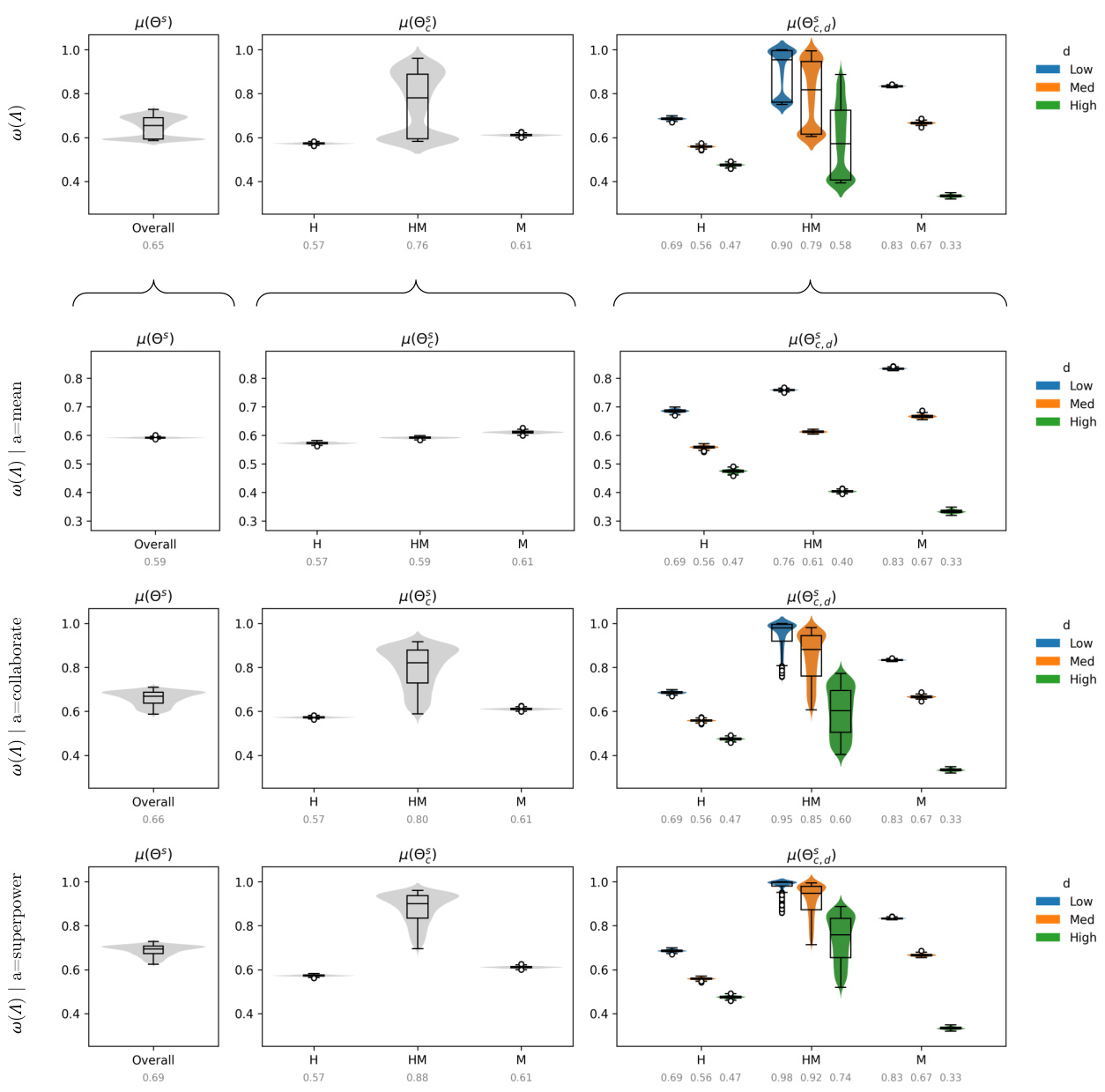 - 采用蒙特卡洛模拟,抽样任务难度d∈{低,中,高}和技能策略c∈{仅人,仅机,人机组合}对应的性能分布P(θ)c,d,e。