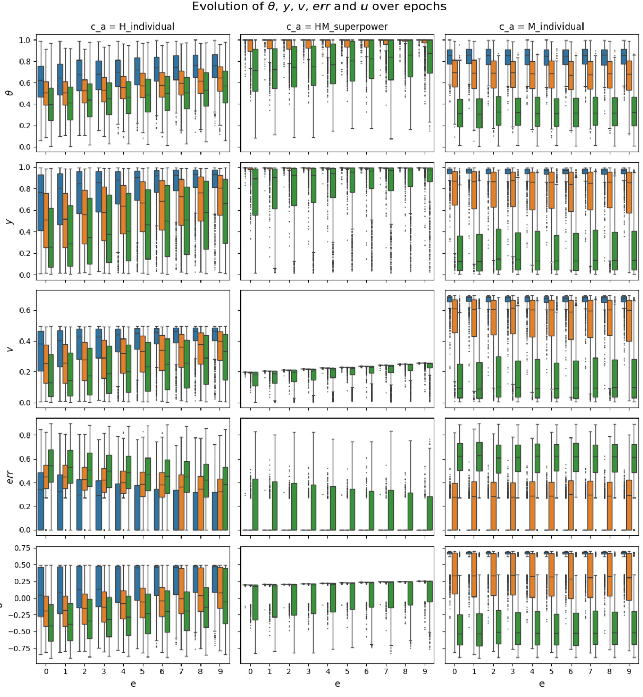 - 图示Beta分布在初始(epoch=0)与最终(epoch=E-1)两个时间点下,不同任务难度(低-蓝、中-橙、高-绿)下,人类和机器策略的性能$\theta$概率密度;