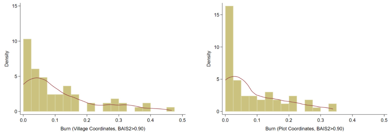 - 建立阈值(burn threshold)区分燃烧与非燃烧区域,结合调查地块坐标和村庄中心坐标两种方法,检验哪种融合空间单元对指标准确性更优。