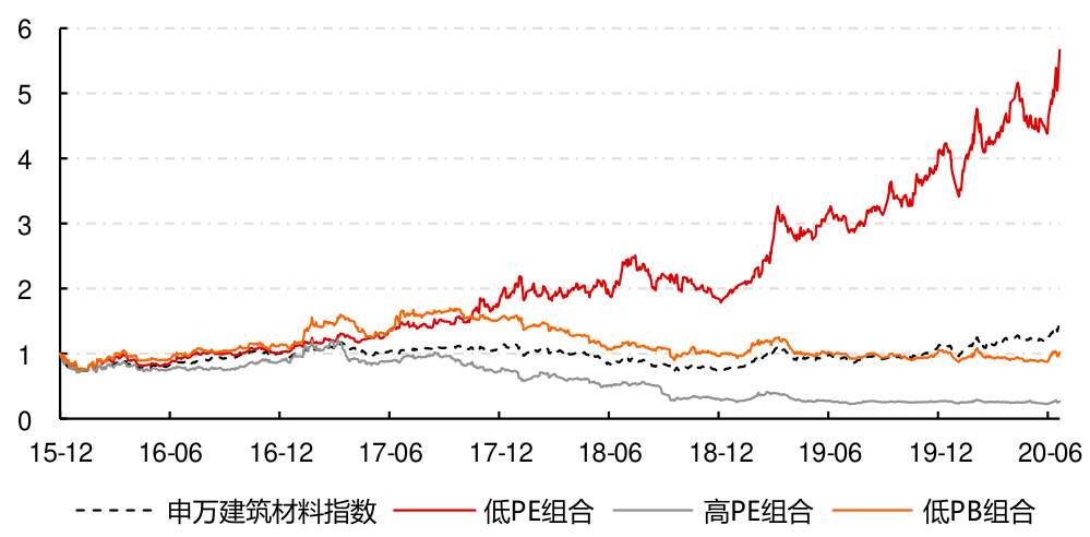 图1:低PE组合优于高PE组合、低PB组合和建材指数(2015.12.31 - 2020.7.20)