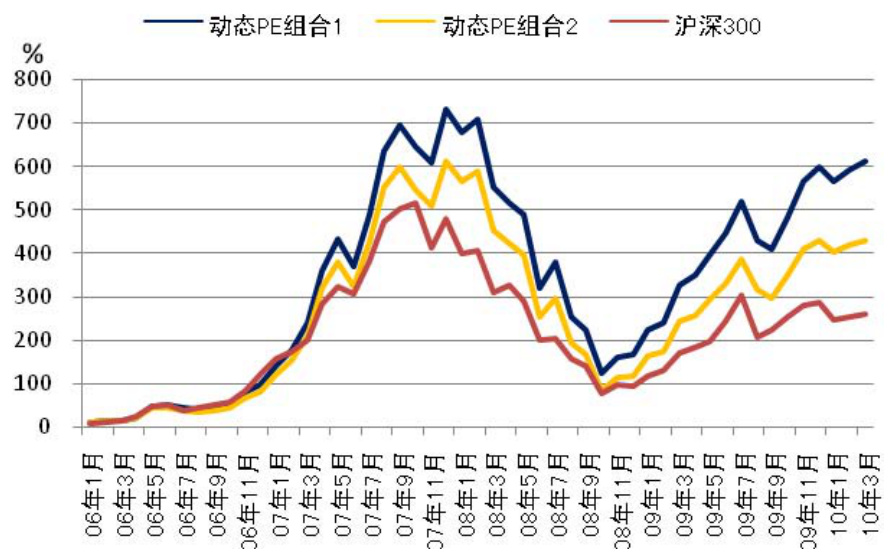 图1:动态PE组合累计收益(模型1与模型2及沪深300对比)