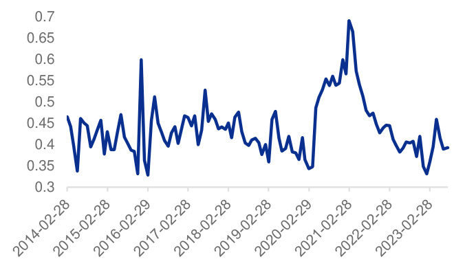 - 图4和图5分别显示2014-2023年合成经济指数和流动性指数的变化趋势,能捕捉宏观经济与流动性的动态变化。