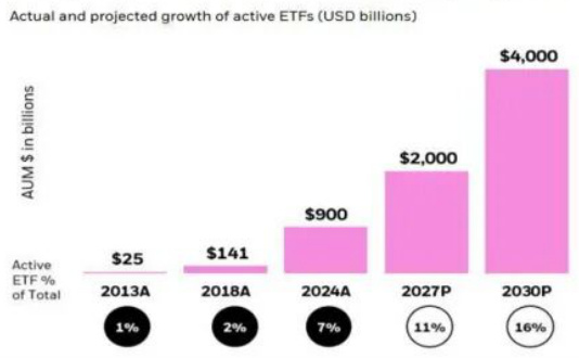 - 主动ETF规模预计2030年达到4万亿美元,较2024年9000亿美元约增加4.4倍。