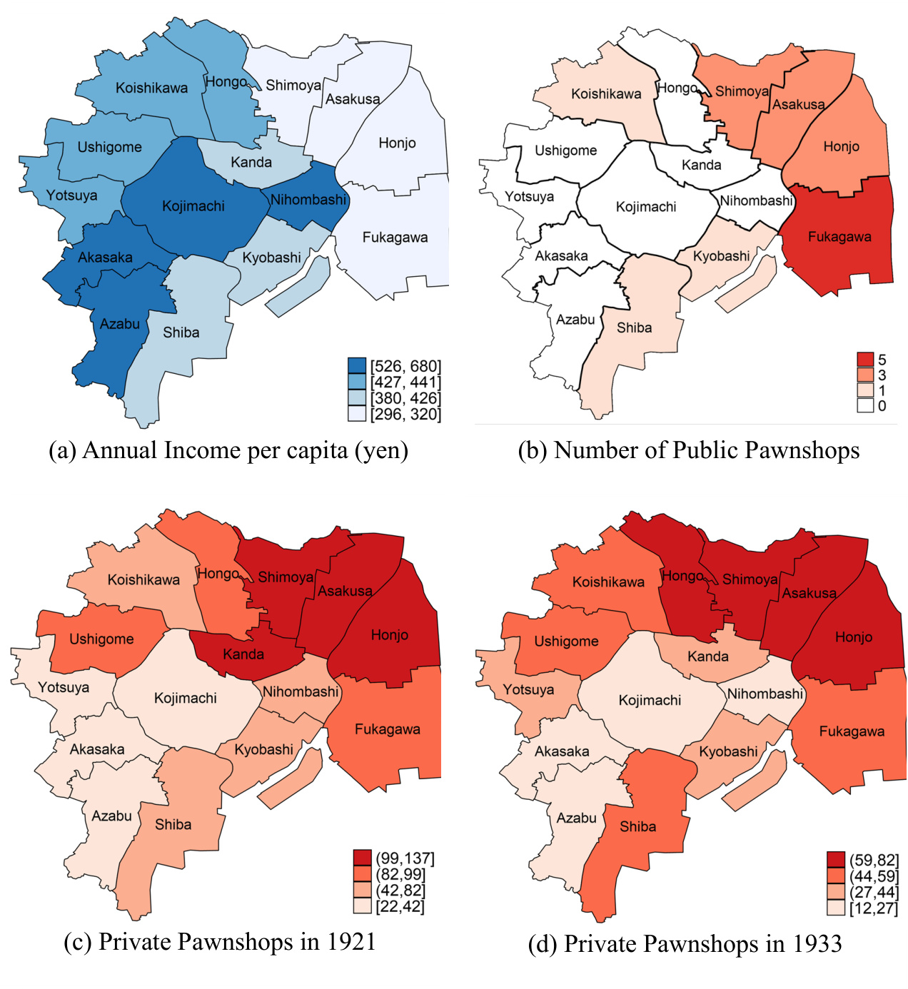 - 作者选取公共当铺作为制度创新案例,对1910s至1930年代的东京展开实证。公共当铺相较于传统盈利私人当铺,提供更低利率、贷款额度上限,有针对性服务低收入群体。