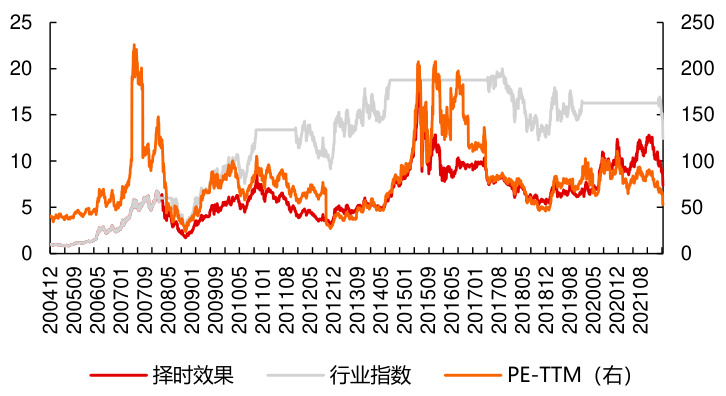 - 橙色线代表PE-TTM估值水平,红色线代表择时策略收益表现,灰色线为行业指数表现。