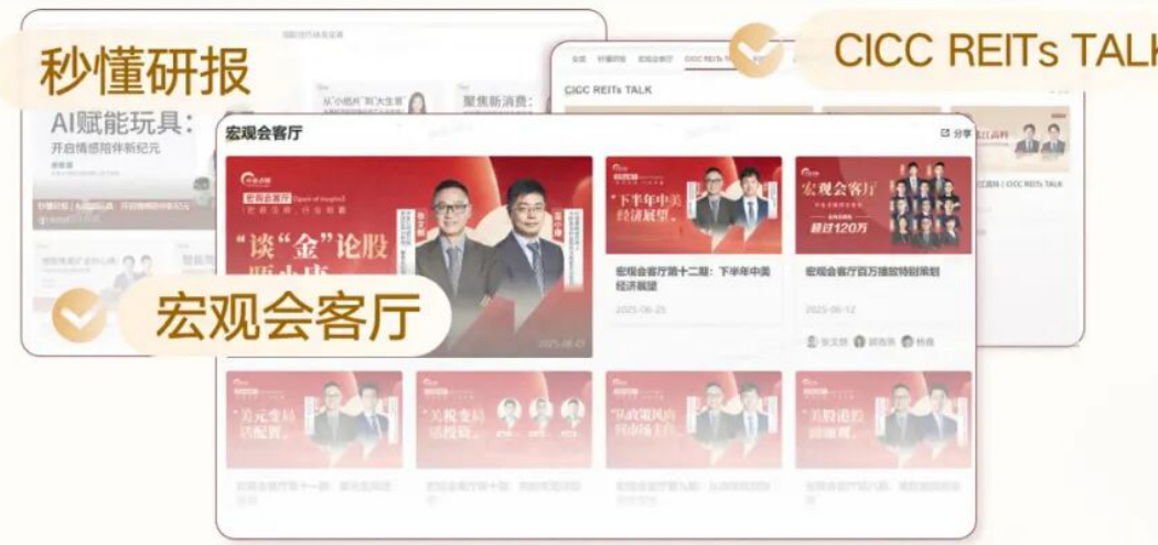 - 设有宏观会客厅、秒懂研报、CICC REITs TALK等多样化内容展示模块。