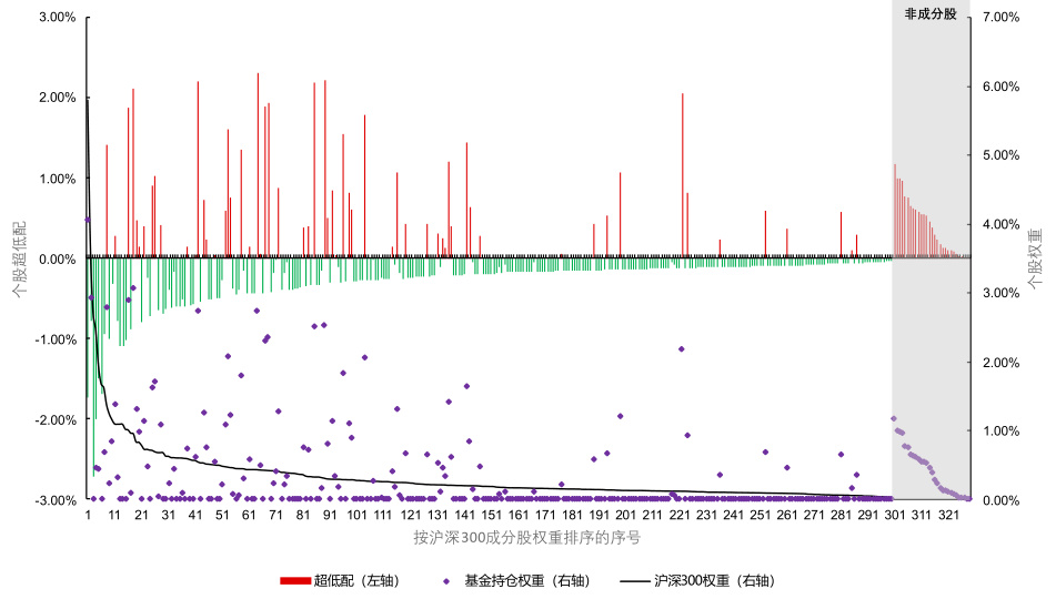- 图8柱状图及散点图揭示基金个股偏离,超配多为新能源、消费等板块领先股;低配集中于中小盘和非成分股。