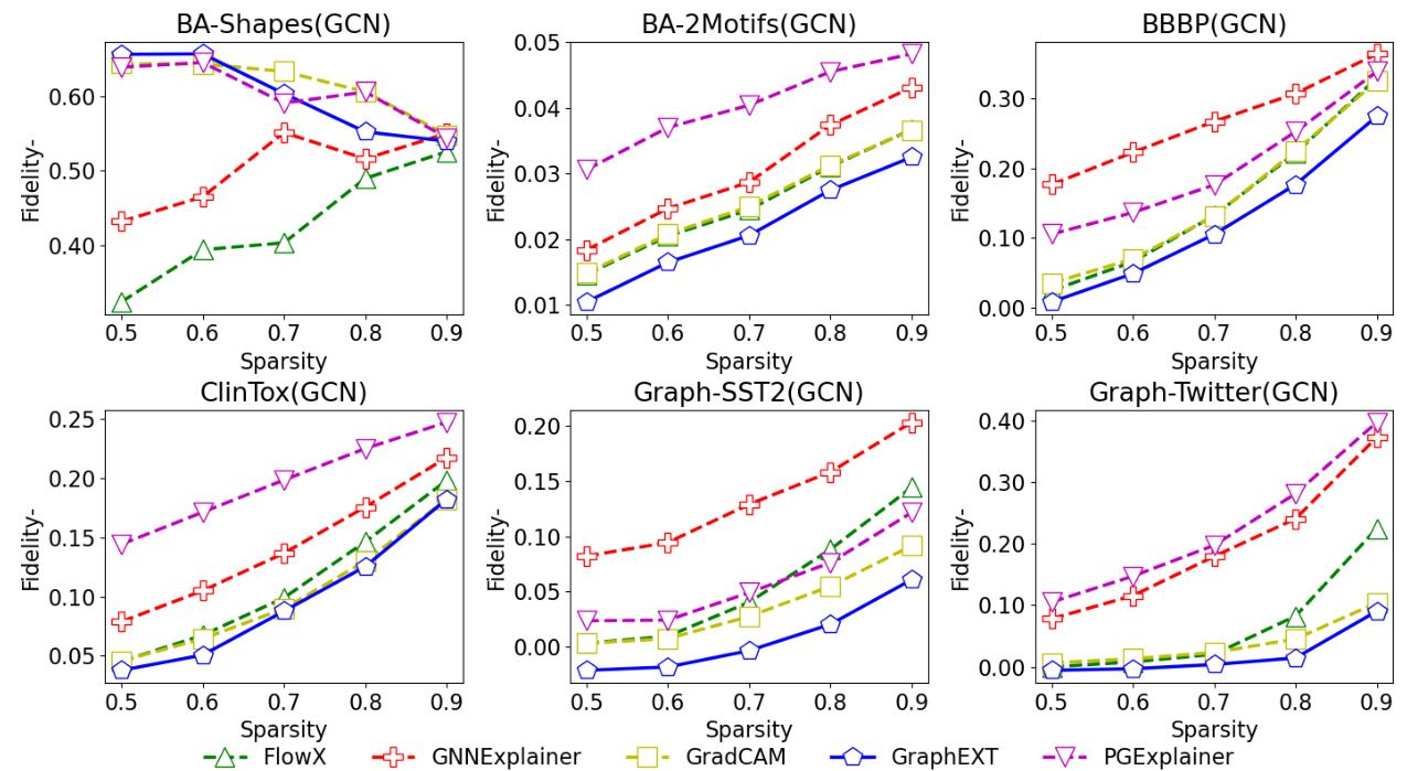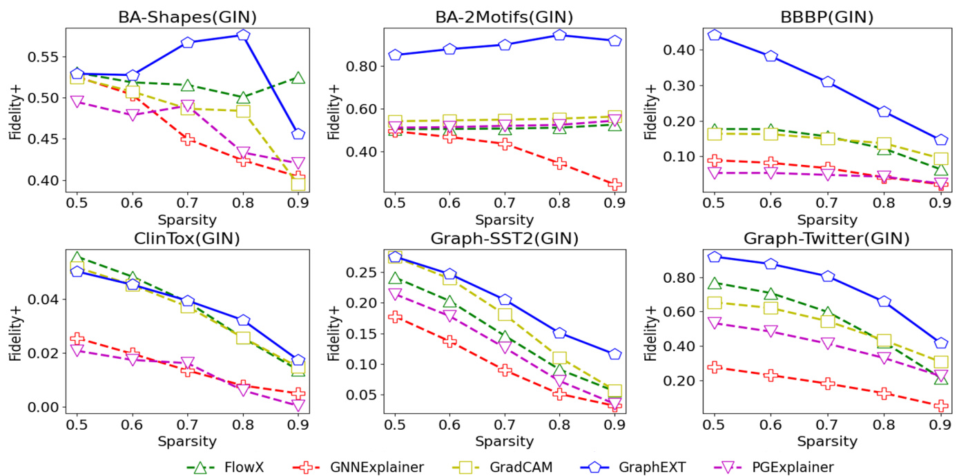 - 图示(GIN模型)中,GraphEXT在大多数稀疏度设置和数据集上均取得最高的Fidelity+,并最小化Fidelity-,表现稳健优越。