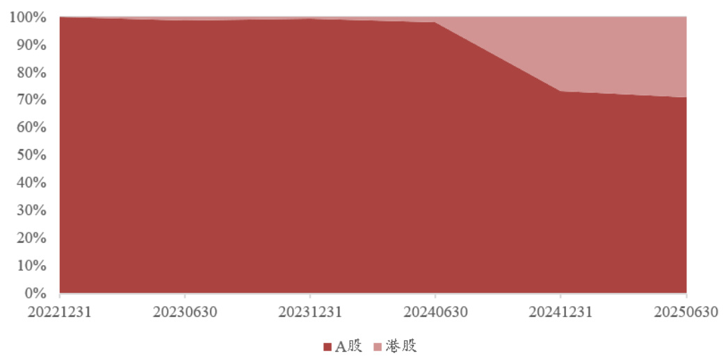 - 近期港股配置自2023年底后持续提升,A股配置占比相对降低至7成,但仍为主力。