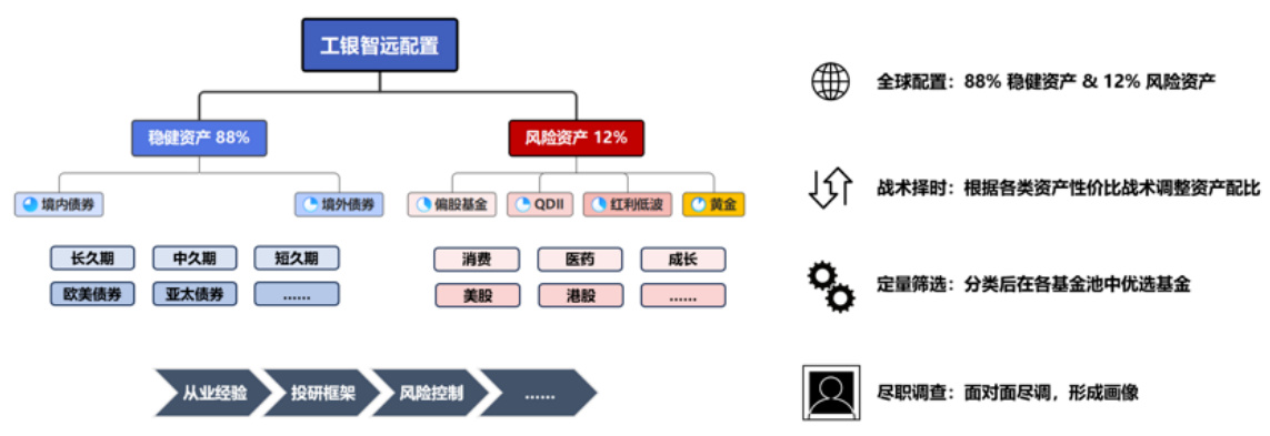 - 描述:展示工银智远配置整个资产范围和投资流程,从88%稳健资产(含境内外债券)到12%风险资产(偏股基金、QDII、美股、红利低波、黄金),结合战术调整、定量选基和尽职调查形成策略闭环。