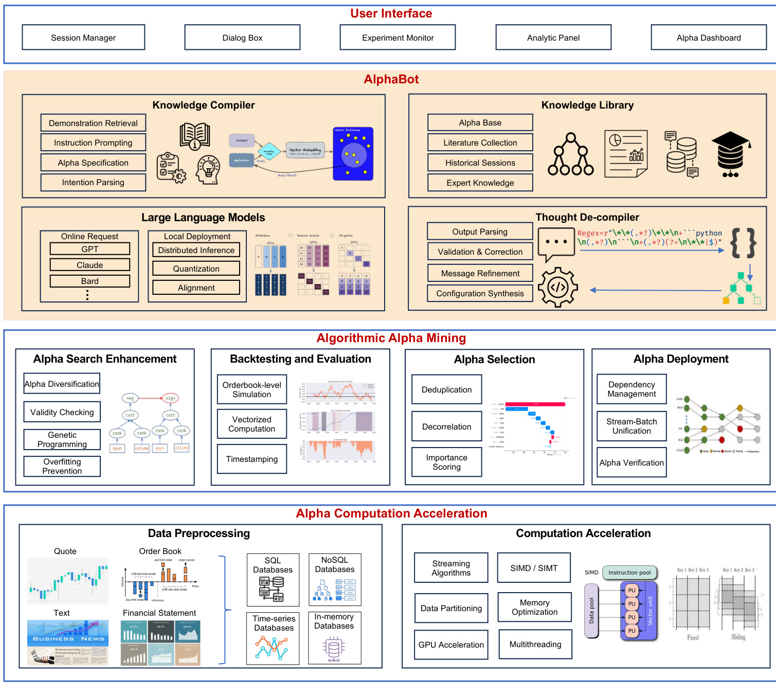 - 描述:从顶层UI,到核心AlphaBot(知识编译器、知识库、LLM、思路解编器),再到算法Alpha挖掘(搜索增强、回测、筛选、部署)和最下层的计算加速模块。