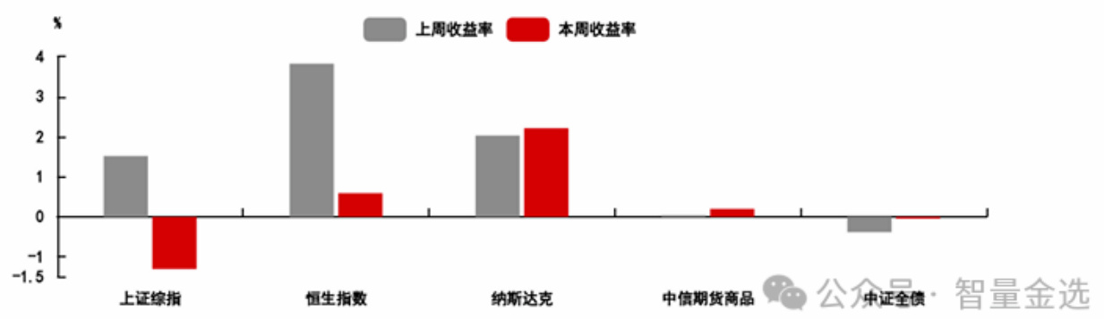 图表展示了上周与本周主要指数(上证综指、恒生指数、纳斯达克、中债期货商品、中证全债)收益率的对比。