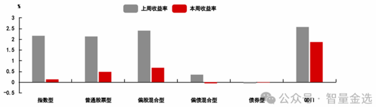 展示了公募基金各类别上周与本周的收益表现对比,包括指数型、普通股票型、偏股混合型、偏债混合型、债券型及QDII基金。