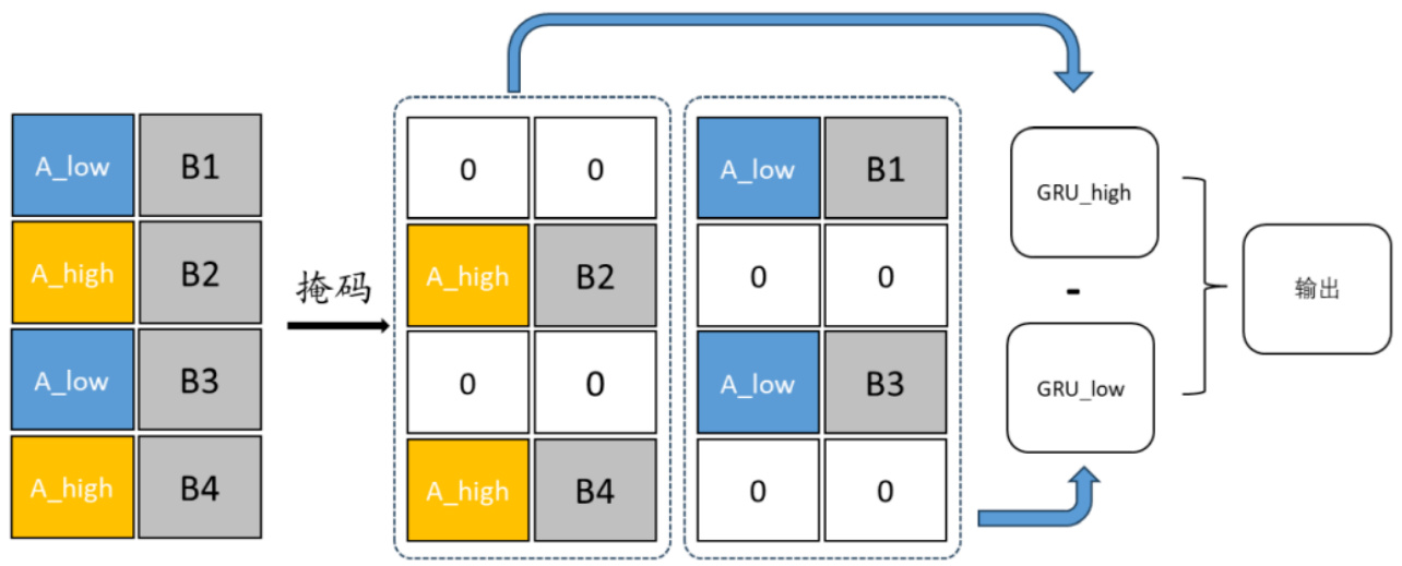 报告用图3详细说明因子切割的一般流程,双变量(A切割指标,B切割对象)经过中位数切割,分成高低两个子群。借助GRU深度学习架构,分别对这两组数据输入不同分支(GRUhigh, GRUlow)以编码时间序列特征,并最终计算分支输出的差异作为因子输出。