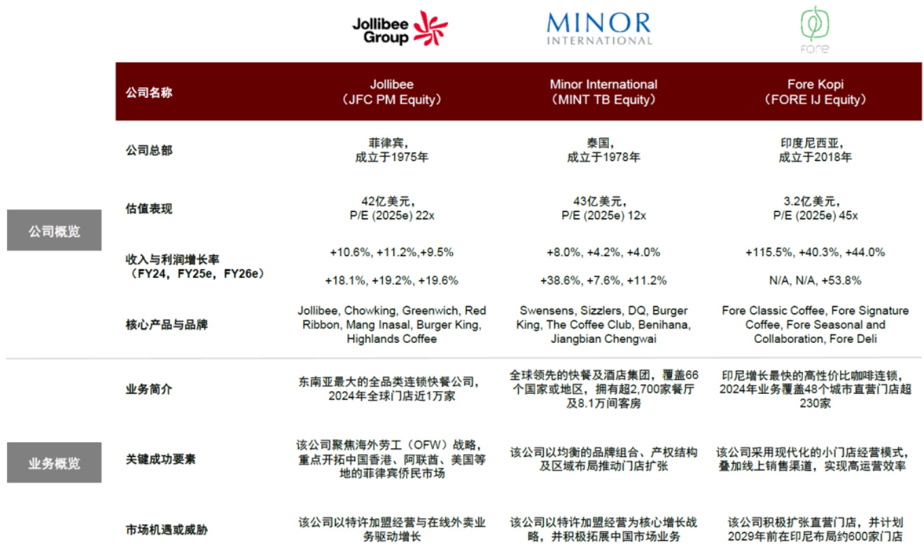 列举了Jollibee、Minor International、Fore Kopi等龙头企业,配置高增长和地域化特点。