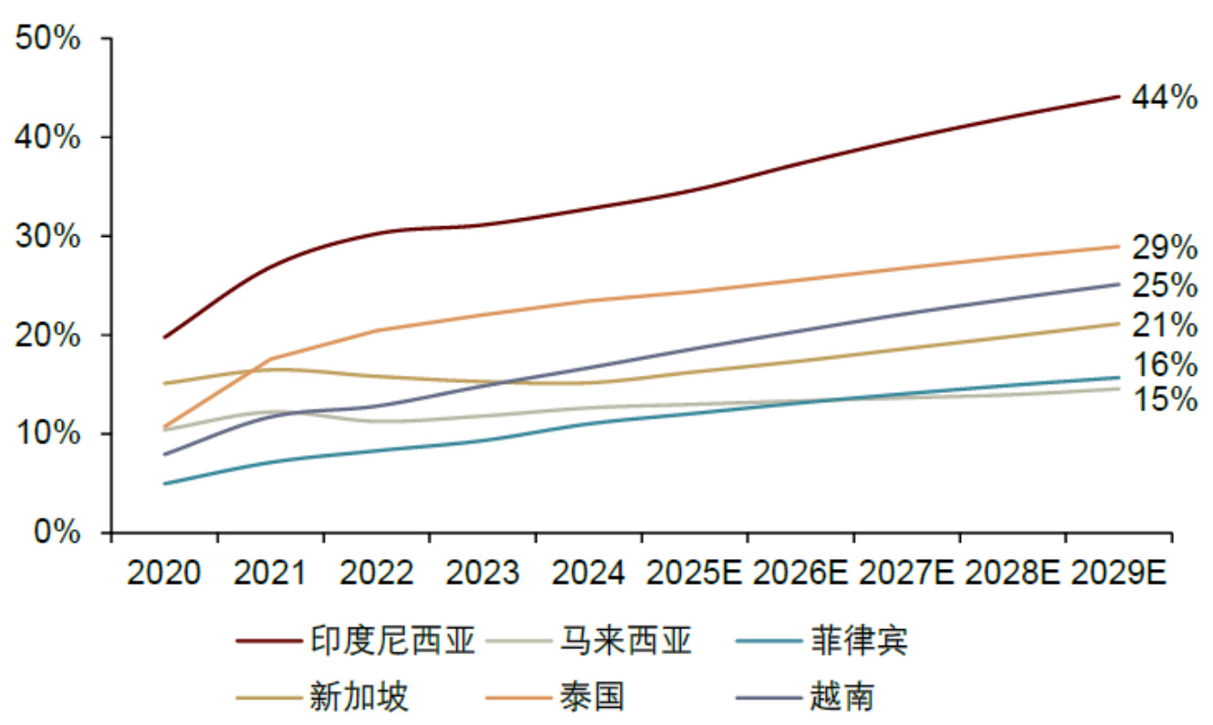 - 线上零售2021-2024年复合增速最高达33%(印度尼西亚),数字经济快速成长。