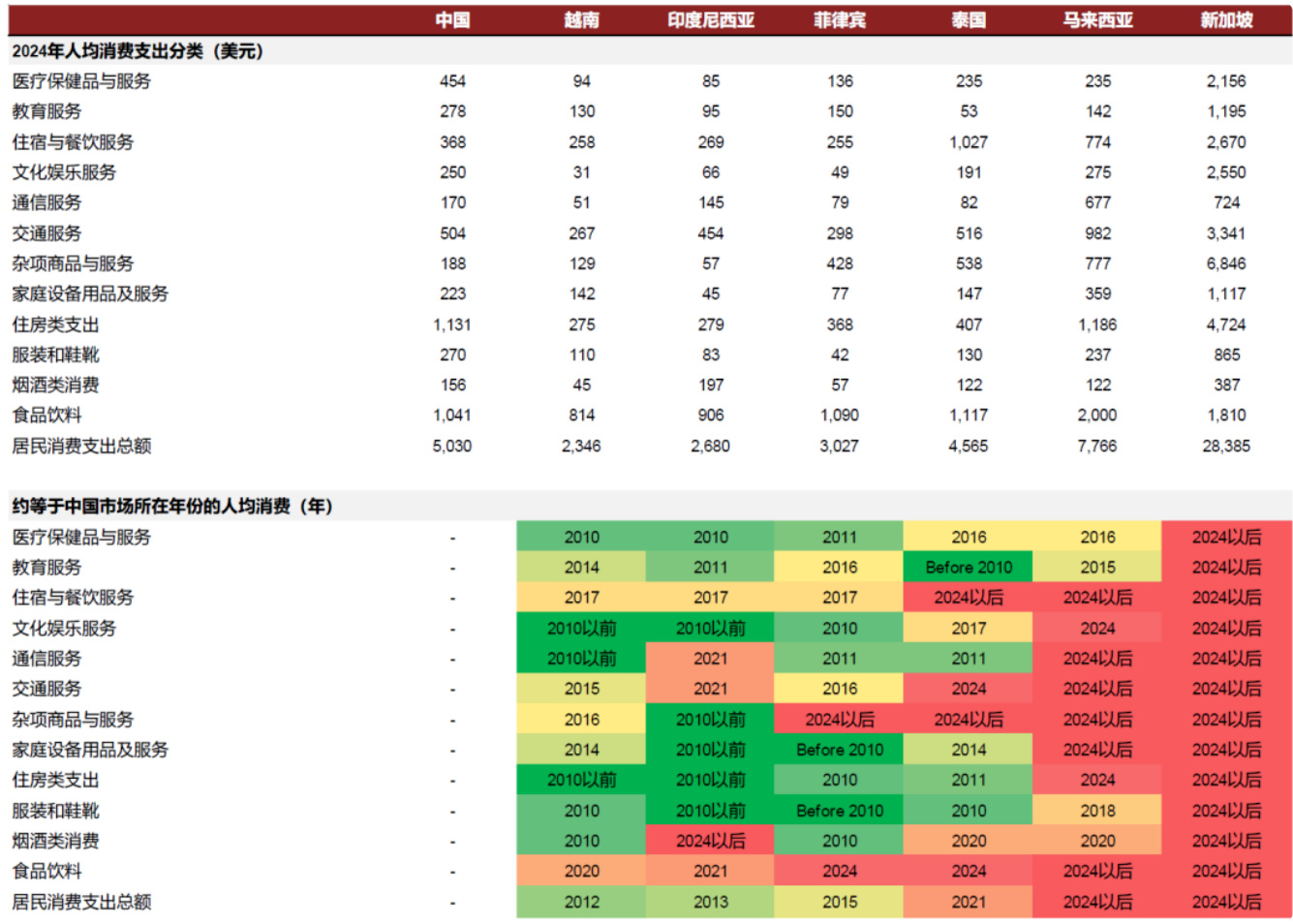 - 越南、印度尼西亚、菲律宾人均消费处于中国2010年代中期水平,市场潜力大;新加坡等成熟市场消费结构更趋高端化。