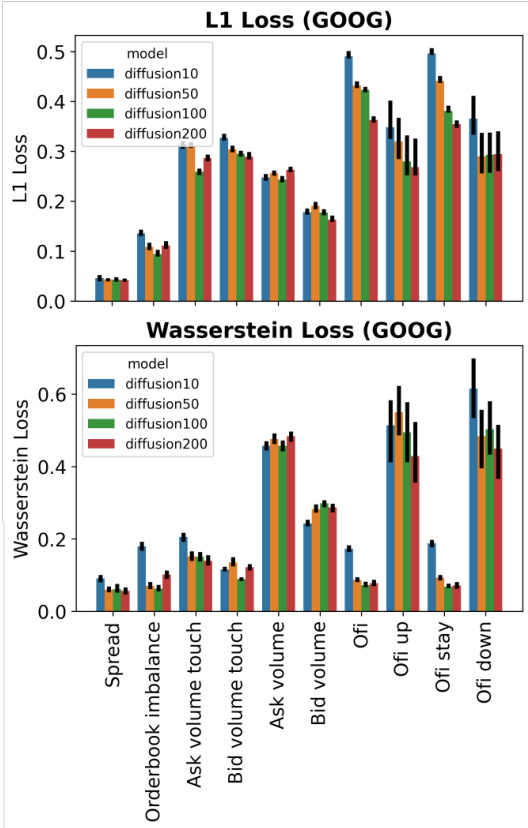 - 与业界基准模型LOBS5及其他生成模型比较,扩散模型在GOOG上L1误差和Wasserstein距离大部分指标优于或持平,尤其Wasserstein距离表现领先。